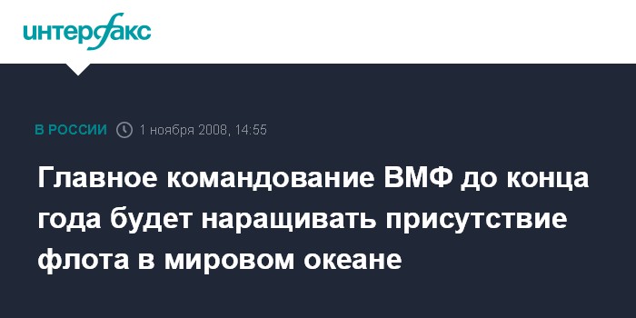 Москва. 1 ноября. INTERFAX.RU - Главное командование ВМФ России в оставшиеся месяцы этого года будет наращивать присутствие сил Военно-морского флота в мировом океане в интересах упрочения стабильности и безопасности в различных его регионах, заявил "Интерфаксу-АВН" помощник главкома ВМФ капитан 1 ранга Игорь Дыгало.