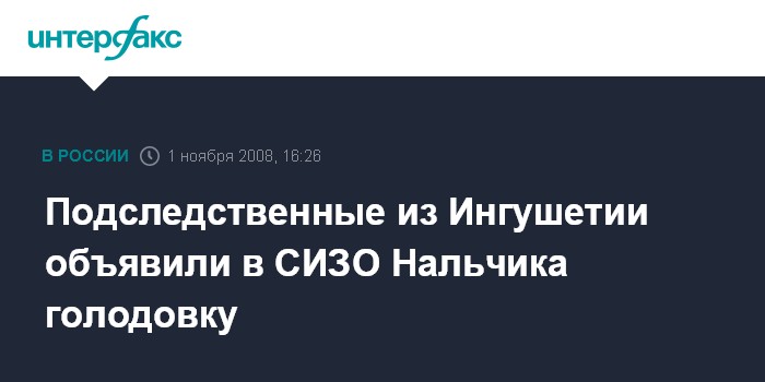 Москва. 1 ноября. INTERFAX.RU - Подследственные из Ингушетии, содержащиеся в СИЗО N1 Нальчика, проводят голодовку. "На сегодняшний день пятеро из них отказались от голодовки. Пятеро пока продолжают, но думаю, что и они откажутся, потому что их требования неправомерны. Они хотят быстрее уехать домой (в Ингушетию - ИФ)", - сообщил в субботу агентству "Интерфакс-Юг" начальник Управления ФСИН по КБР Ахмед Абидов. По его словам, состояние здоровья голодающих контролируется врачами, и, по их свидетельству, те "неплохо себя чувствуют".