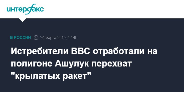 Москва. 24 марта. INTERFAX.RU - На полигоне Ашулук в астраханской области экипажи истребителей центра боевой подготовки и переучивания летного состава ВВС выполнили перехват самолетов и крылатых ракет условного противника, сообщил "Интерфаксу" во вторник официальный представитель ВВС полковник Ашулук .