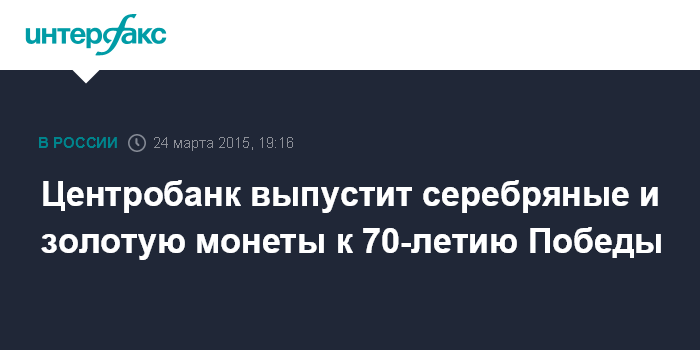 Москва. 24 марта. INTERFAX.RU - Банк России 26 марта выпускает в обращение памятные серебряные монеты номиналом 3 рубля, 25 рублей и золотую монету номиналом 50 рублей серии "70-летие Победы советского народа в Великой Отечественной войне 1941-1945 гг.", сообщается в пресс-релизе ЦБ РФ.