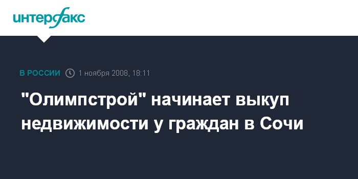 Москва. 1 ноября. INTERFAX.RU - Госкорпорация "Олимпстрой" объявила о начале процедуру выкупа объектов недвижимости у граждан, чьи земельные участки и домовладения находятся в зоне олимпийского строительства.