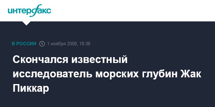 Женева. 1 ноября. INTERFAX.RU - Известный швейцарский изобретатель и исследователь морских глубин Жак Пиккар скончался на 87 году жизни в Швейцарии. О его кончине сообщили сын Бертран Пикар и коллеги по работе.