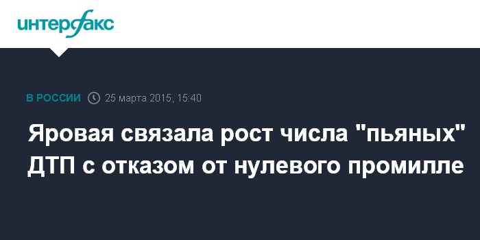 Москва. 25 марта. INTERFAX.RU - За год количество "пьяных" ДТП после введения нормы о разрешенных промилле возросло, в том числе увеличилось на 47% число погибших, заявила глава комитета Госдумы по безопасности и противодействию коррупции Ирина Яровая.