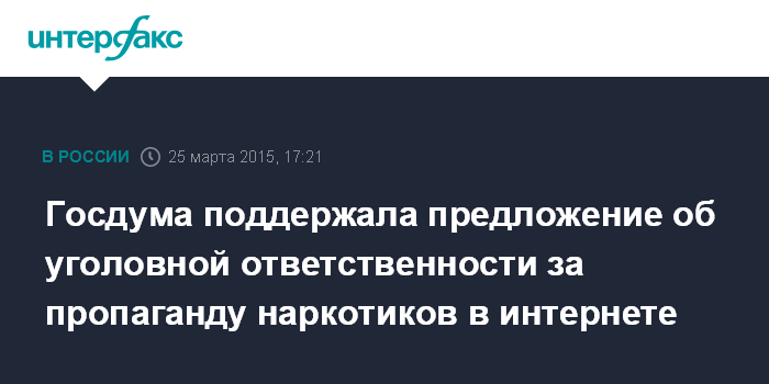 Москва. 25 марта. INTERFAX.RU - Госдума в среду приняла в первом чтении законопроект, предлагающий ввести уголовную ответственность за пропаганду наркотиков в интернете.