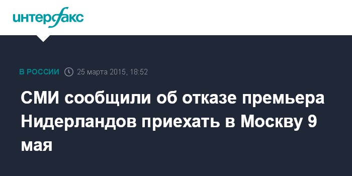 Москва. 25 марта. INTERFAX.RU - Премьер-министр Нидерландов Марк Рютте не приедет в Москву на майский парад, посвященный 70-летию Победы в Великой Отечественной войне, сообщает в среду нидерландская газета NRC Handelsblad.