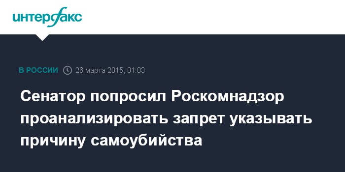Москва. 26 марта. INTERFAX.RU - Замглавы комитета по конституционному законодательству Совета Федерации Константин Добрынин направил главе Роскомнадзора Александру Жарову обращение c просьбой проанализировать решение о запрете указывать причину самоубийства на предмет его соответствия действующему законодательству, а также возможному нарушению конституционных прав граждан. Об этом сам Добрынин заявил "Интерфаксу".