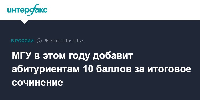 Отвечая на уточняющий вопрос "Интерфакса", ректор МГУ пояснил, что, таким образом, 10 дополнительных баллов получат все выпускники этого года, однако выпускники прошлых лет их не получат, поскольку сочинение было впервые введено для 11-классников в декабре 2014 года.