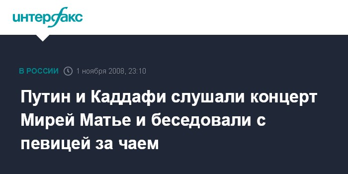 Москва. 1 ноября. ИНТЕРФАКС - Премьер-министр Владимир Путин и находящийся в Москве с визитом лидер ливийской революции Муамар Каддафи прибыли на концерт французской певицы Мирей Матье, который проходит в Государственном Кремлевском дворце.