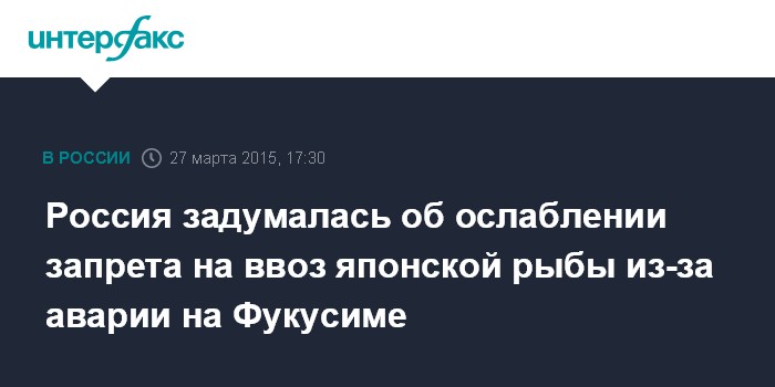 Москва. 27 марта. INTERFAX.RU - Россельхознадзор не исключает ослабления режима запрета на поставки рыбы из Японии, который был введен из-за аварии на атомной электростанции Фукусима-1 в 2011 году.