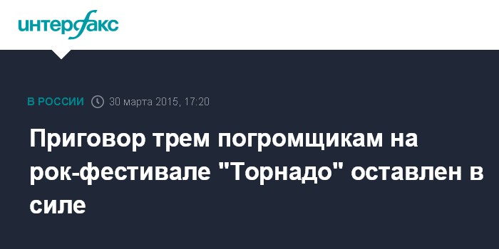 Москва. 30 марта. INTERFAX.RU - Верховный суд России оставил в силе приговор в отношении трех участников погрома, устроенного на рок-фестивале "Торнадо" в Челябинской области в 2010 году, сообщили в Генеральной прокуратуре РФ.