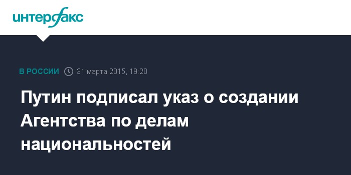 Москва. 31 марта. INTERFAX.RU - Президент России Владимир Путин подписал Указ "О Федеральном агентстве по делам национальностей", сообщает во вторник пресс-служба Кремля.
