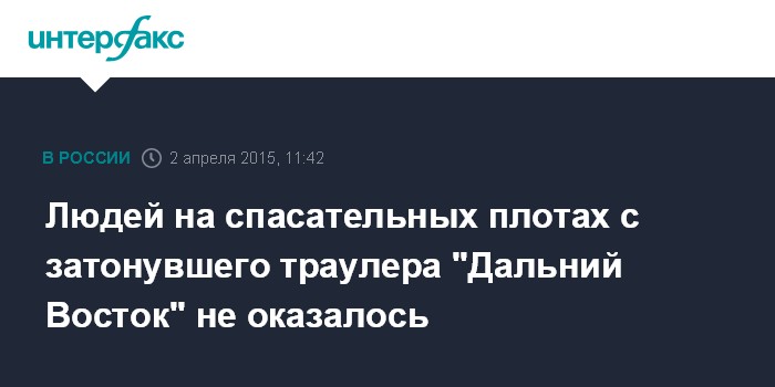 Москва. 2 апреля. INTERFAX.RU - На двух спасательных плотах с затонувшего в Охотском море большого автономного морозильного траулера (БАТМ) "Дальний Восток" людей обнаружить не удалось, сообщил "Интерфаксу" в четверг представитель регионального управления МЧС России.