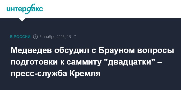 "Д.Медведев и Г.Браун обсудили вопросы подготовки к посвященному проблематике мирового финансового кризиса "Саммиту 20-ти", который состоится 15 ноября сего года в Вашингтоне. С обеих сторон была отмечена важность сверки позиций накануне этого ответственного мероприятия", - говорится в сообщении.