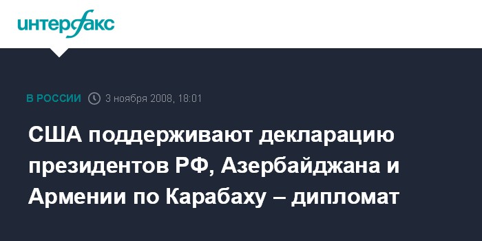 Баку. 3 ноября. INTERFAX.RU - США полностью поддерживают принятую накануне в Москве декларацию глав России, Азербайджана и Армении по карабахскому урегулированию, заявил азербайджанскому телеканалу ANS в понедельник американский сопредседатель Минской группы ОБСЕ Мэтью Брайза.