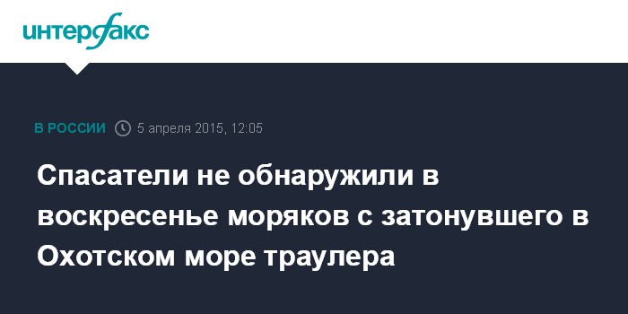 Москва. 5 апреля. INTERFAX.RU - Никого из 13 пропавших моряков с траулера "Дальний Восток", затонувшего в Охотском море, в воскресенье обнаружить не удалось, сообщил "Интерфаксу" представитель ГУ МЧС России по Камчатскому краю.