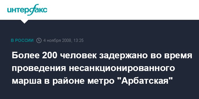 "Во время проведения несанкционированной акции в районе станции метро "Арбатская" было задержано более 200 человек. Милиция сработала корректно. В настоящий момент со стороны участников несанкционированной акции проявлений агрессии нет", - сказал он.