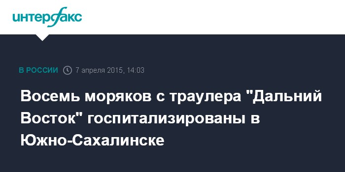 Москва. 7 апреля. INTERFAX.RU - По итогам обследования пострадавших с затонувшего в Охотском море траулера "Дальний Восток" восемь человек госпитализированы в больницы Южно-Сахалинска, сообщили "Интерфаксу" в пресс-службе областного Минздрава.