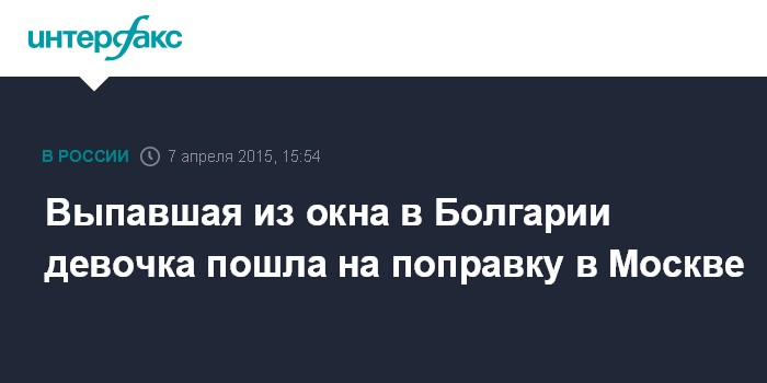Москва. 7 апреля. INTERFAX.RU - Трехлетняя девочка, пострадавшая в результате падения из окна в Болгарии, идет на поправку в московской больнице.