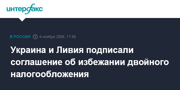 Москва. 4 ноября. INTERFAX.RU - Украина и Ливия во вторник в Киеве подписали соглашение об избежании двойного налогообложения. Об этом во вторник передает корреспондент агентства "Интерфакс-Украина". Также подписан меморандум о взаимопонимании в сфере стандартизации и метрологии. Подписание документов состоялось после проведения двусторонних переговоров.