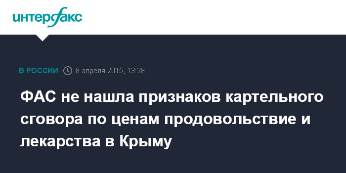 Москва. 8 апреля. INTERFAX.RU - Федеральная антимонопольная служба не нашла признаков картельного сговора в формировании цен на лекарства, продукты питания и топлива в Крымском федеральном округе, хотя уровень цен на эти группы товаров выше, чем в других регионах России.
