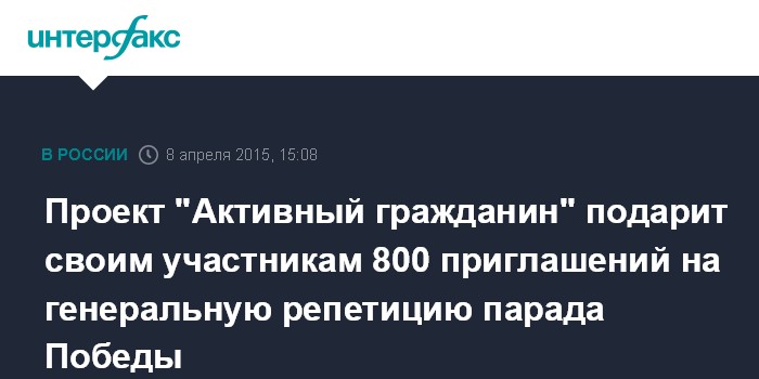 Москва. 8 апреля. INTERFAX.RU - Участники проекта "Активный гражданин" впервые получат именные приглашения на генеральную репетицию парада Победы, которые смогут передать ветеранам Великой Отечественной войны, сообщает пресс-служба проекта.