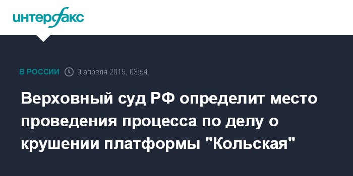 "Обращение Поронайского городского суда, поступившее в Сахалинский областной суд, 7 апреля 2015 года областной суд направил в Верховный суд для разрешения вопроса об изменении территориальной подсудности по уголовному делу о крушении буровой платформы "Кольская", - сообщили "Интерфаксу" в Сахалинском областном суде.