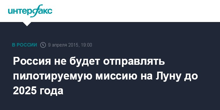 Москва. 9 апреля. INTERFAX.RU - Проект Федеральной космической программы на 2016-2025 годы не предусматривает выполнение российской пилотируемой миссии на Луну, заявил глава Роскосмоса Игорь Комаров в интервью "Российской газете", которое будет опубликовано в пятницу.