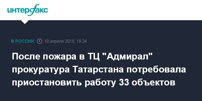Москва. 10 апреля. INTERFAX.RU - Многочисленные нарушения требований пожарной безопасности выявила прокуратура Татарстана в ходе проверки, начатой в регионе после крупного пожара в ТЦ "Адмирал".