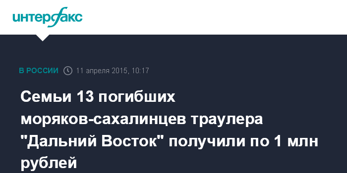 Москва. 11 апреля. INTERFAX.RU - Семьи тринадцати погибших моряков-сахалинцев с траулера "Дальний Восток" получили по 1 млн рублей из областного бюджета, сообщает пресс-служба правительства региона.