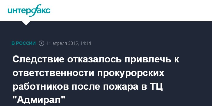 По его словам, основанием для такого решения стало отсутствие "прямой причинно-следственной связи между действием (отказом прокуратуры от требования приостановить работу ТЦ "Адмирал" - ИФ) и последствием (пожаром в торговом центре - ИФ)".