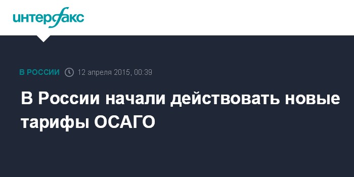 Москва. 12 апреля. INTERFAX.RU - Новые базовые тарифы по обязательному страхованию автогражданской ответственности (ОСАГО) вступают в силу с 12 апреля по всей территории РФ. Тарифы были скорректированы Банком России после вступления в силу с 1 апреля этого года положений закона об ОСАГО о повышении лимита выплат за ущерб жизни и здоровью пострадавших в ДТП со 160 тыс. рублей до 500 тыс. рублей.