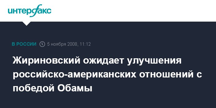 Москва. 5 ноября. INTERFAX.RU - Лидер ЛДПР, вице-спикер Госдумы Владимир Жириновский считает, что победа Барака Обамы на президентских выборах в США станет началом улучшения российско-американских отношений.