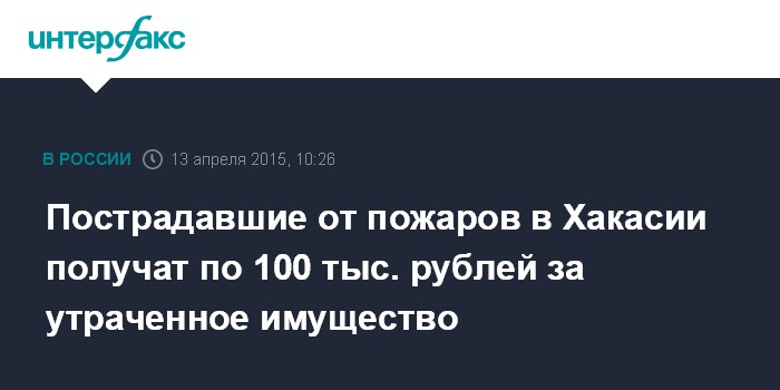 Москва. 13 апреля. INTERFAX.RU - Из резервного фонда пострадавшим от пожаров в Хакасии будет выделено по 100 тыс. рублей компенсации за утраченное имущество, а также единовременную помощь, заявил глава МЧС России Владимир Пучков.