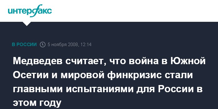 "Этот год стал для наших граждан не только временем новых надежд и достижений. Произошли события ставшие, я уверен, очень значимыми для каждого в нашей стране и одновременно серьезным испытанием для всей России. Это - варварская агрессия против Южной Осетии и, конечно, набирающий обороты глобальный финансовый кризис", - сказал Медведев, выступая в среду с Посланием к Федеральному Собранию.