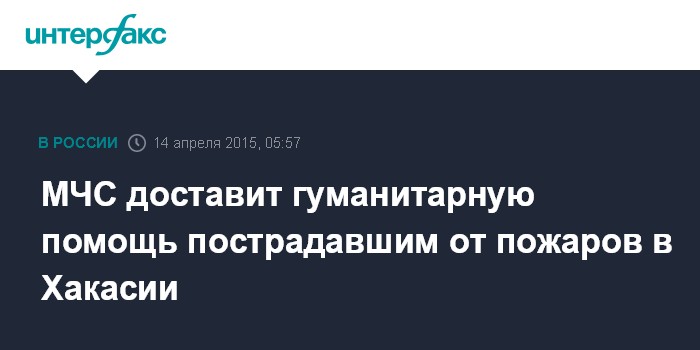 Москва. 14 апреля. INTERFAX.RU - МЧС России доставит в Хакасию, пострадавшую от пожаров, гуманитарную помощь, сообщает во вторник пресс-служба ведомства.