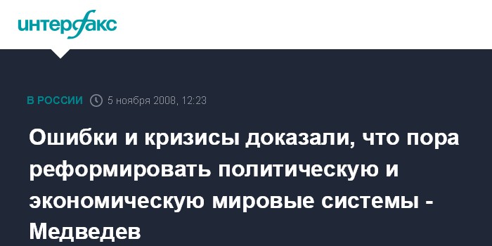 "Урок ошибок и кризисов 2008 г. доказал всем ответственным нациям, что пора действовать, и нужно радикально реформировать политическую и экономическую систему", - заявил Медведев, вступая с ежегодным Посланием к Федеральному Собранию в среду.