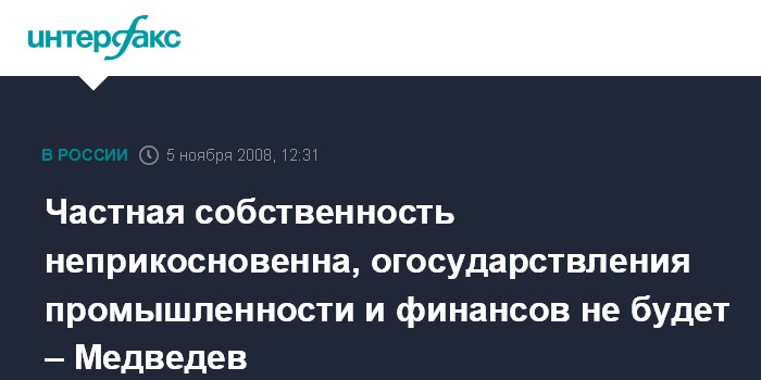 Частная собственность неприкосновенна, огосударствления промышленности и финансов не будет – Медведев