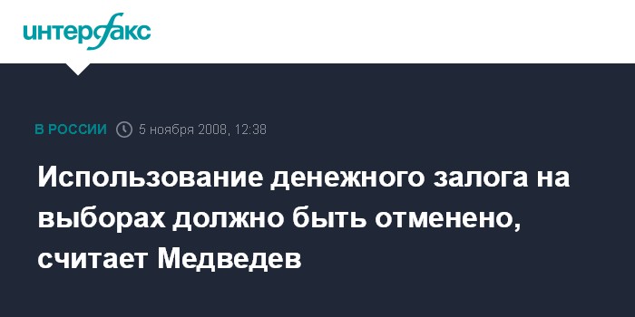"Использование денежного залога на выборах всех уровней должно быть отменено", - заявил Д.Медведев в среду в ежегодном Послании Федеральному Собранию. По словам президента РФ, "участвовать в выборах или нет, должны решать не деньги, а мнение людей, репутация партии и доверие избирателей к ее программе".