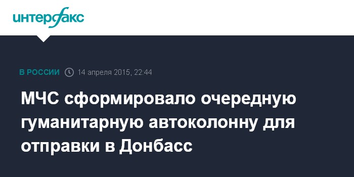 Предыдущая российская автоколонна с гуманитарной помощью прибыла в Донецк 2 апреля. Автомобили привезли 1,4 тысяч тонн гуманитарной помощи. С середины августа прошлого года колоннами МЧС в Донбасс уже доставлено более 30 тысяч тонн первоочередных гуманитарных грузов.
