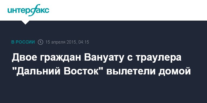 Москва. 15 апреля. INTERFAX.RU - Двое граждан Вануату, спасенных при крушении в Охотском море траулера "Дальний Восток", утром в среду вылетели домой рейсовым самолетом.