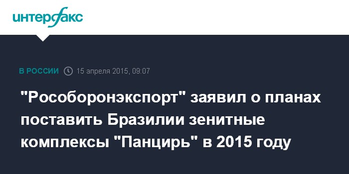 Москва. 15 апреля. INTERFAX.RU - "Рособоронэкспорт" рассчитывает подписать контракт на поставку Бразилии российских зенитных ракетно-пушечных комплексов (ЗРПК) "Панцирь-С1" в 2015 году, сообщил заместитель гендиректора компании Сергей Гореславский.