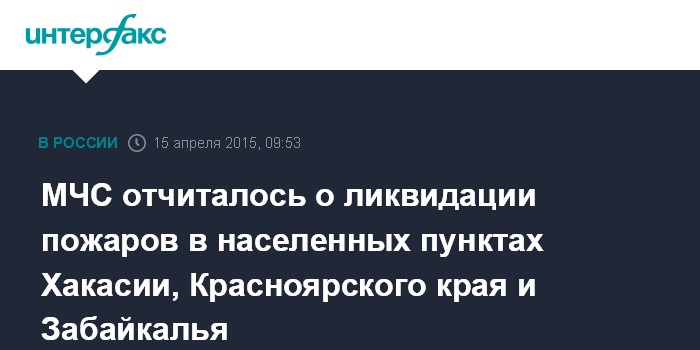 Москва. 15 апреля. INTERFAX.RU - МЧС России сообщает о ликвидации пожаров в населенных пунктах Хакасии, Красноярского края и Забайкалья.