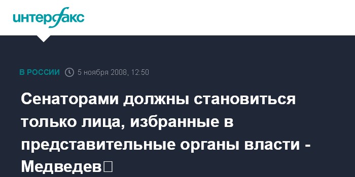 "Совет Федерации должен формироваться только из числа лиц, избранных в представительные органы власти и депутатов местного самоуправления в соответствующем субъекте Федерации", - заявил Д.Медведев, выступая с ежегодным Посланием Федеральному Собранию.
