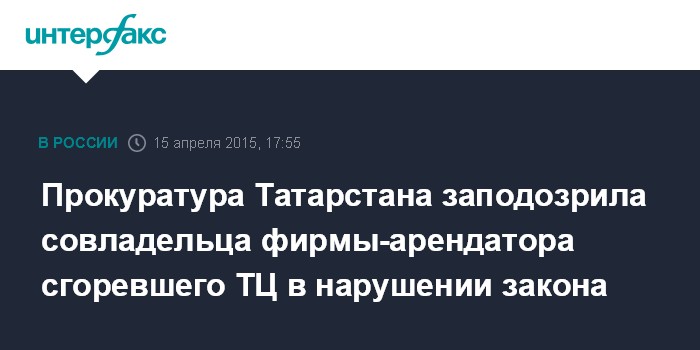 Москва. 15 апреля. INTERFAX.RU - Прокурор Татарстана Илдус Нафиков направил в СУ СК России по республике материалы проверки для решения вопроса об уголовном преследовании фактического совладельца ООО "Заря" (фирма-арендатор сгоревшего ТЦ "Адмирал") Анатолия Агрба.