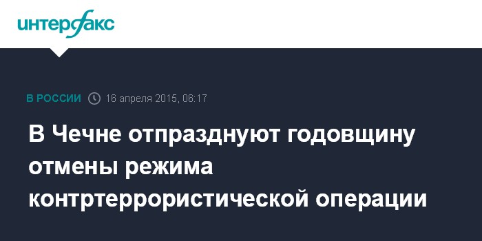 Москва. 16 апреля. INTERFAX.RU - В Чечне отметят день отмены режима контртеррористической операции.