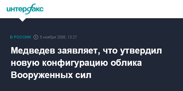 Он отметил также, что им приняты соответствующие решения о перевооружении армии и флота современной техникой. "Я утвердил новую конфигурацию облика Вооруженных сил нашей страны. Соответствующие поручения правительству даны", - добавил Медведев.