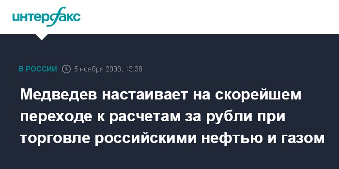 "Нужно предпринять практические шаги по укреплению роли рубля в качестве одной из валют при осуществлении международных расчетов и наконец начать переход к расчетам в рублях, который мы, к сожалению, затянули, прежде всего, за газ и за нефть", - заявил Медведев, выступая в среду с ежегодным посланием Федеральному Собранию.