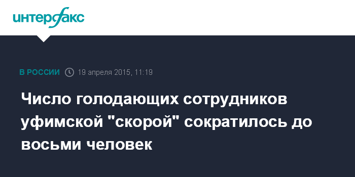 Москва. 19 апреля. INTERFAX.RU - Восемь сотрудников станции скорой помощи Уфы (ССМП) продолжают голодовку против оказываемого, по их мнению, административного давления со стороны руководства, сообщила "Интерфаксу" участница голодовки Ирина Тишина в воскресенье.