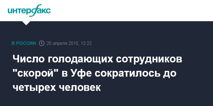 Москва. 20 апреля. INTERFAX.RU - Еще четыре сотрудника станции скорой медицинской помощи (ССМП) Уфы прекратили голодовку протеста, сообщила в понедельник "Интерфаксу" участница акции Ирина Тишина.