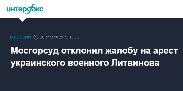 Москва. 20 апреля. INTERFAX.RU - Мосгорсуд признал законным продление ареста до 13 мая военнослужащему украинской армии Сергею Литвинову, обвиняемому российскими следователями в применении запрещенных методов ведения войны в Донбассе.